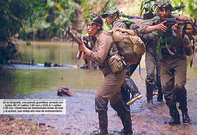 | En la fotografía, una patrulla guerrillera, armada con fusiles AK-47 calibre 7.62 mm y M16 A-1 calibre