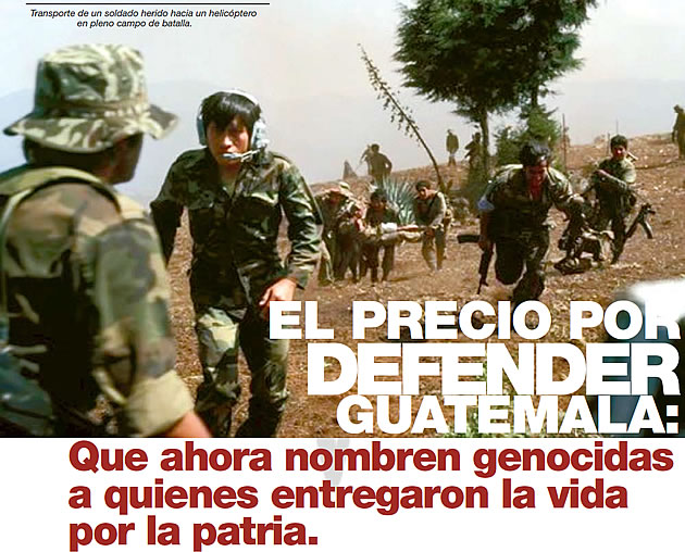 | Condenar de genocidio a un soldado de Guatemala, es condenarlos a todos, incluso a los que murieron a manos de los que hoy pretenden esta farsa de juicio. No importa cuántos años tengan derrochando el dinero de sus cómplices con vallas publicitarias hablando de genocidio. Tampoco importa cuán expertos sean para mentir dramáticamente, la verdad es que nuestros soldados eran indígenas y sólo en una mente enferma puede caber la idea que se les daría la orden de asesinar indígenas. Decir que nuestros soldados obedecían la orden de asesinar indígenas o pobres, es insultar la inteligencia de los guatemaltecos que aman la verdad y la paz. |