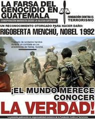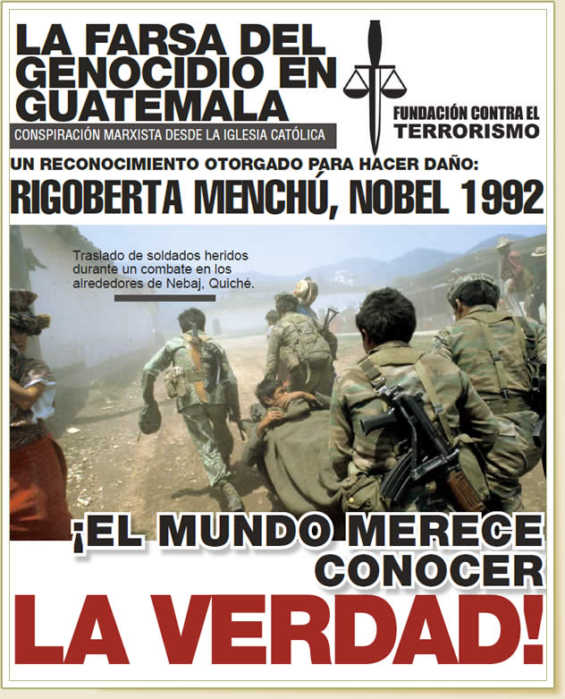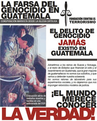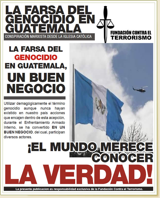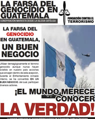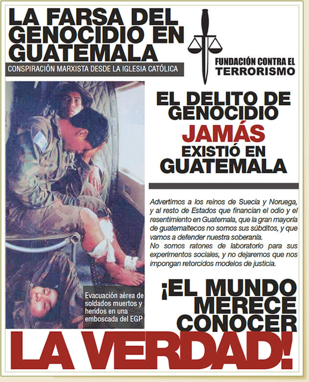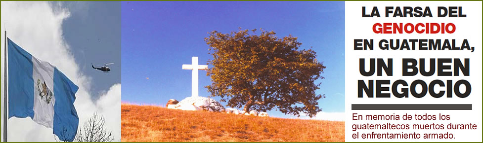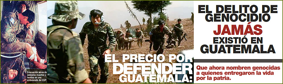 | Condenar de genocidio a un soldado de Guatemala, es condenarlos a todos, incluso a los que murieron a manos de los que hoy pretenden esta farsa de juicio. No importa cuántos años tengan derrochando el dinero de sus cómplices con vallas publicitarias hablando de genocidio. Tampoco importa cuán expertos sean para mentir dramáticamente, la verdad es que nuestros soldados eran indígenas y sólo en una mente enferma puede caber la idea que se les daría la orden de asesinar indígenas. Decir que nuestros soldados obedecían la orden de asesinar indígenas o pobres, es insultar la inteligencia de los guatemaltecos que aman la verdad y la paz. |